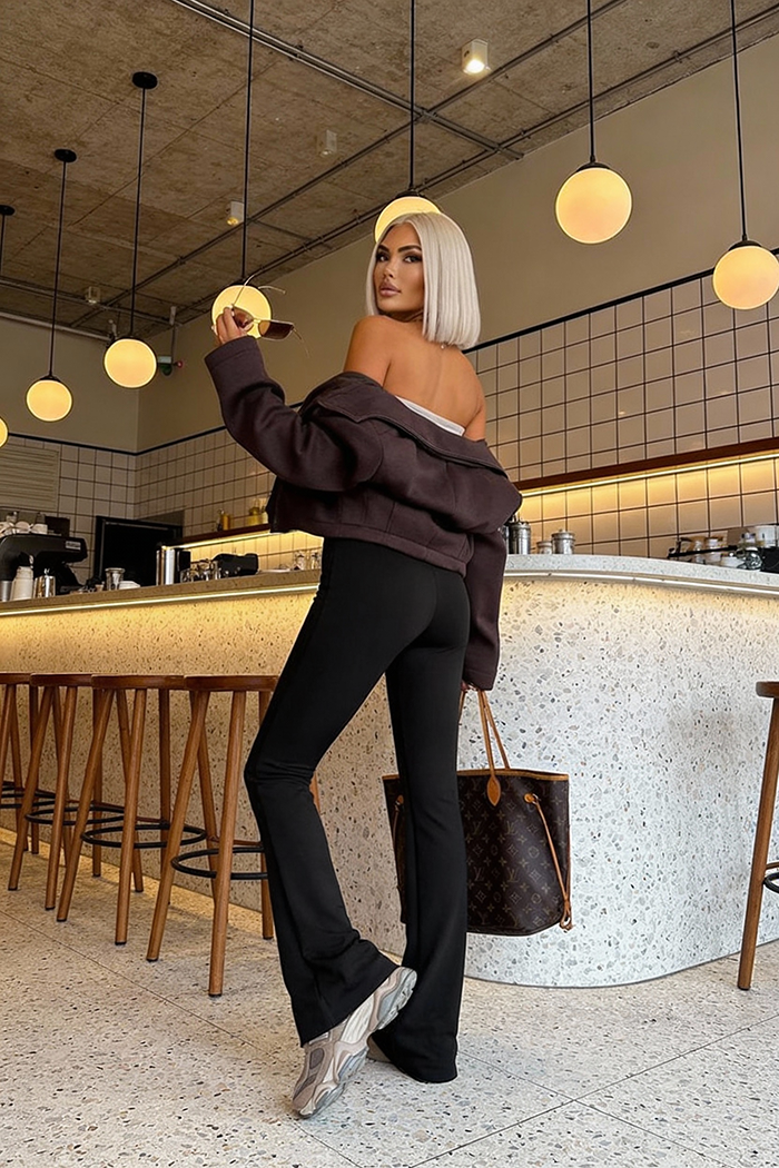 Spodnie wykonane z wyjątkowo miękkiej, wiskozowej dzianiny premium. Krój spodni przepięknie modeluje sylwetkę - rozszerzane nogawki pięknie wydłużają nogi, a elastyczny materiał dopasowuje się do każdej figury, podkreślając kobiece kształty.