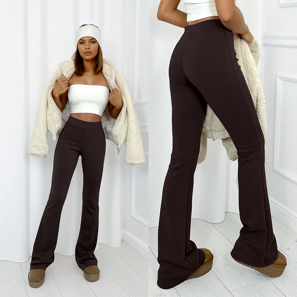 Spodnie wykonane z wyjątkowo miękkiej, wiskozowej dzianiny premium. Krój spodni przepięknie modeluje sylwetkę - rozszerzane nogawki pięknie wydłużają nogi, a elastyczny materiał dopasowuje się do każdej figury, podkreślając kobiece kształty.