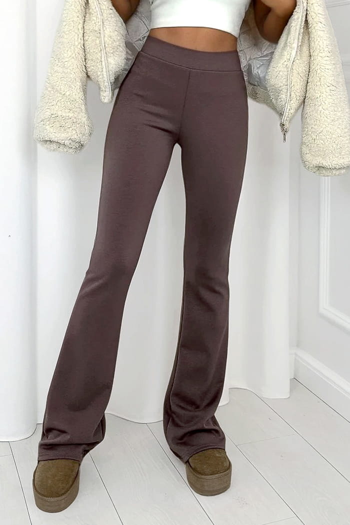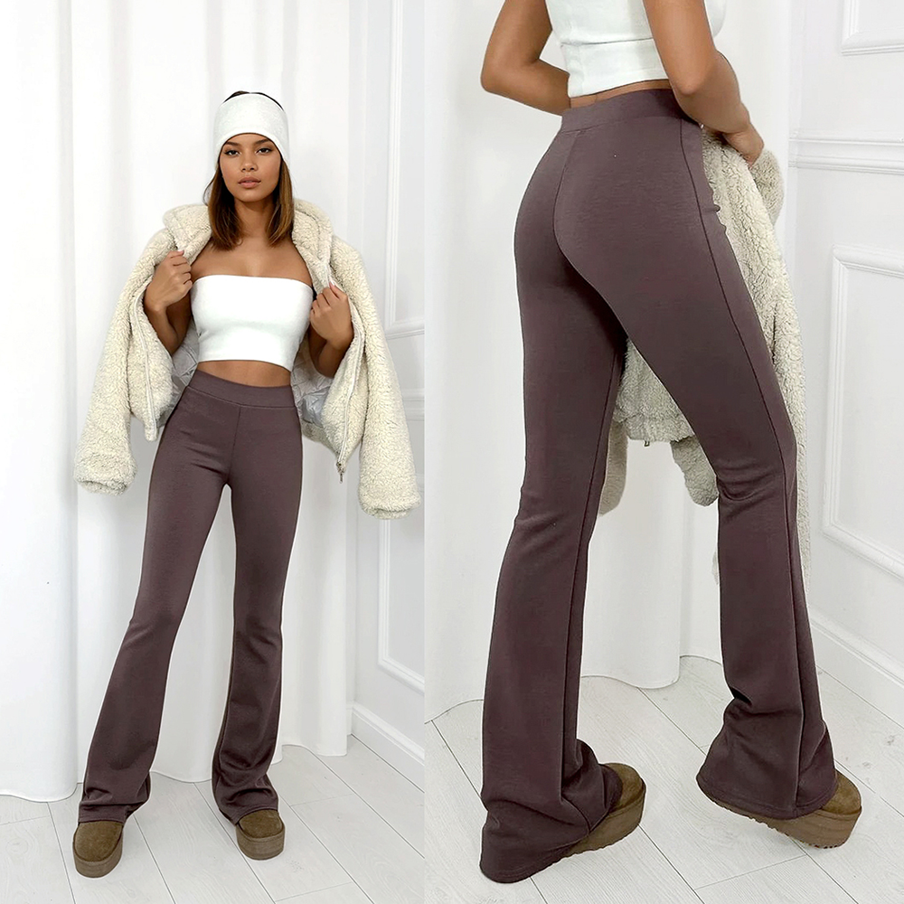Spodnie wykonane z wyjątkowo miękkiej, wiskozowej dzianiny premium. Krój spodni przepięknie modeluje sylwetkę - rozszerzane nogawki pięknie wydłużają nogi, a elastyczny materiał dopasowuje się do każdej figury, podkreślając kobiece kształty.